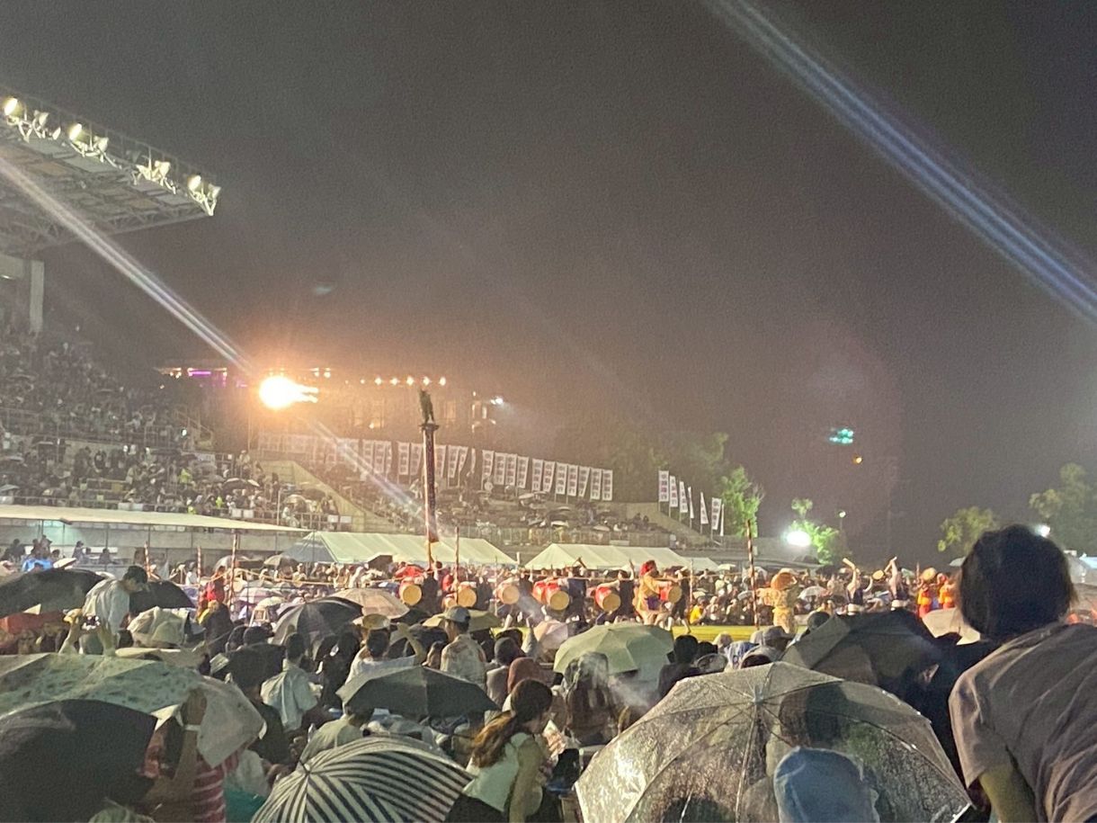 〈雨が降って慌てて傘を出す観客たち、演舞を続ける青年会〉