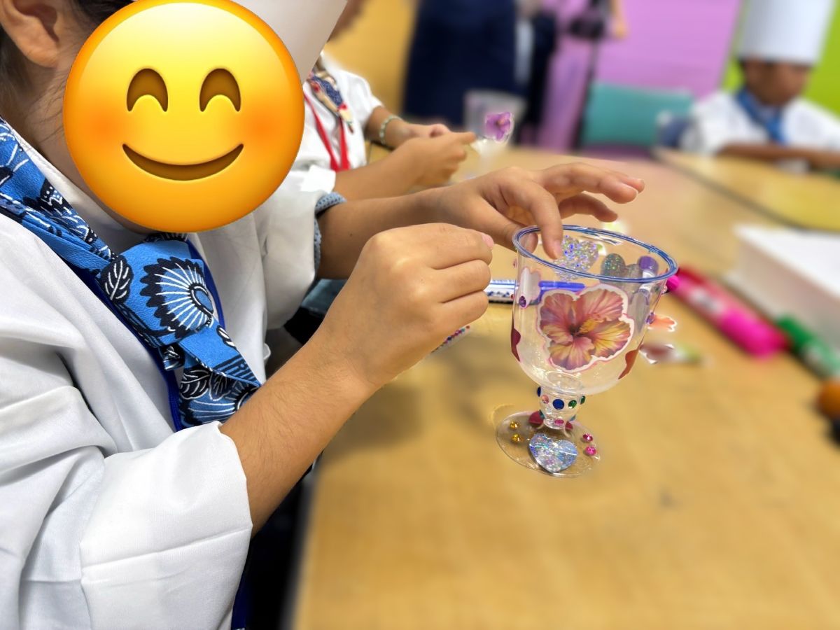あいさつの練習が終わると、次はオリジナルのデコレーショングラス作りです。ペンやシールを使って、自由に飾り付けます。グラス全体をカラフルに塗る子、イラストを描く子、シールをペタペタ貼る子…ひとりひとり全然違っていて、見ているだけで楽しい時間です。