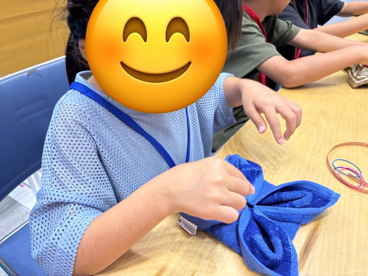 こどもたちが挑戦したのは、タオルアートの中でも簡単なレベル1のお花、レベル2のペンギン、レベル3のくまの3つ。お手本を見ながらマネして作っていくのですが、これが難しい!やわらかいタオルが思うように形にならず、みんな悪戦苦闘です。