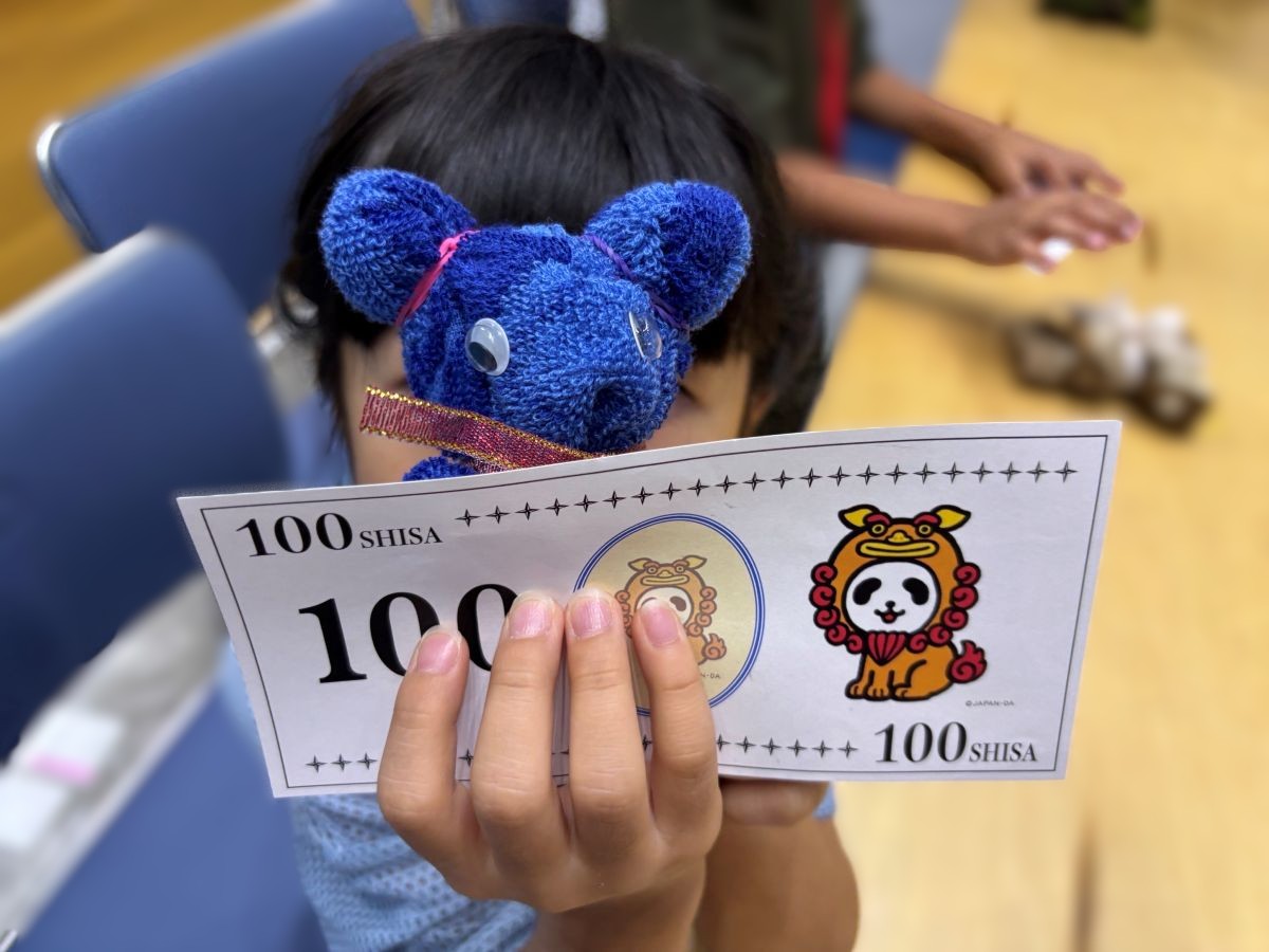 最後には作ったタオルアートのくまさんと、お給料の100シーサーをもらってご満悦。「楽しかった〜!もっとやりたい!」と名残惜しそうでした。