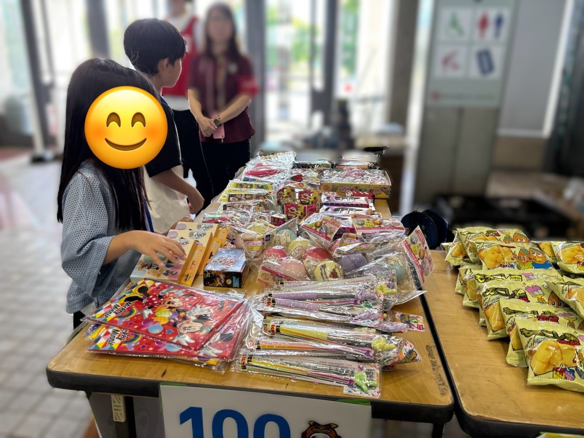お買い物体験では自分で稼いだ200シーサーを手に、好きなおもちゃやおかしを購入できます。合流したこどもたちは「あっちは50シーサーで、こっちが100シーサーで買えるものだよ」とお互いに教えあって、真剣な顔でどれにするか迷っています。