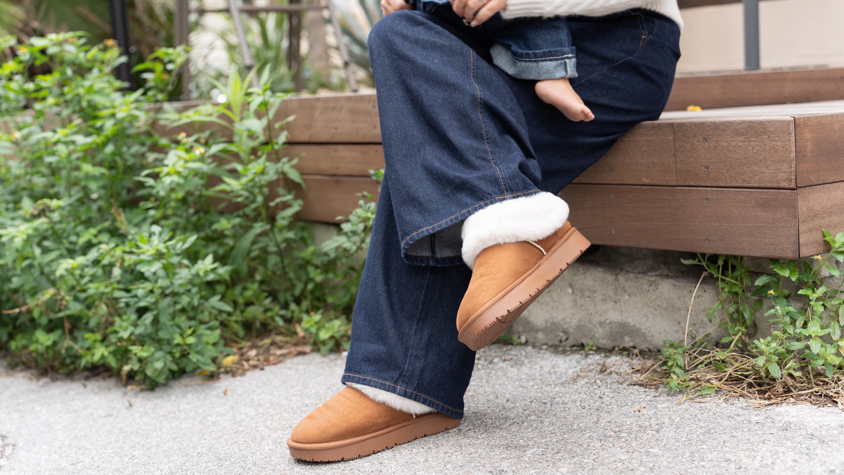 足元のフェイクムートンスリッパは、白いボアが歩くたびにふわっとのぞいて、冬らしい可愛さを足元に添えてくれます。