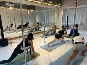 皮膚をポールに密着させるためには、ある程度の露出も必要。だからこそ、レッスンでは短いパンツやブラトップで鏡の前に立つ時間が増えます。1時間ずっと、自分の姿を鏡で見るなんて、普通に生活してたらなかなかないですよね。「あー見たくない…」と思う瞬間も含めて、今の自分をまるっと受け止める時間になっています。