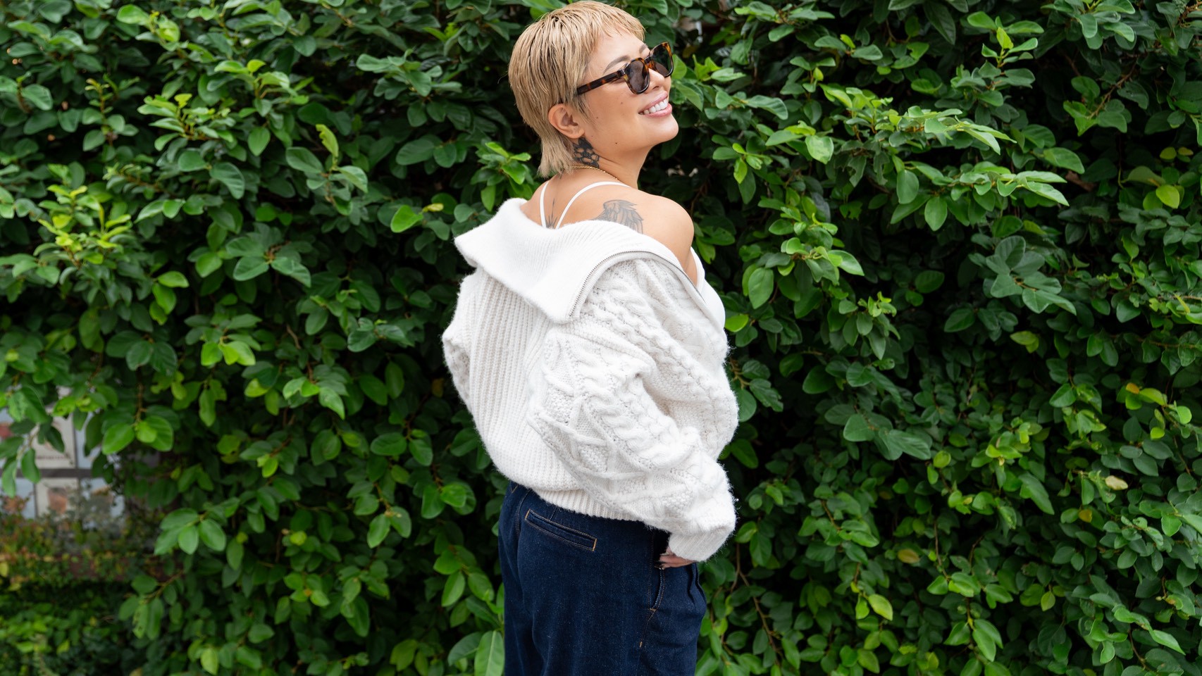 お腹がちらりと見えるショート丈のインナーに、ダブルジップの白ニットをさらっと羽織ることで、女性らしい柔らかさとスタイリッシュさを同時に叶えたバランスに。