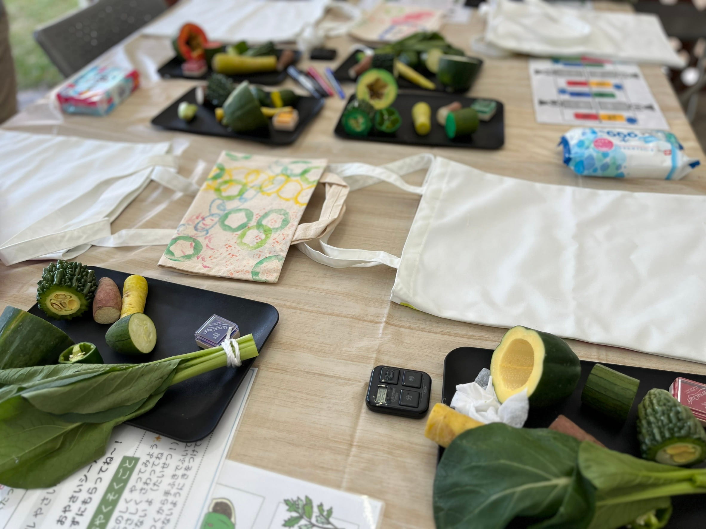 ゴーヤやヘチマなど、沖縄の島野菜を使ってスタンプをペタペタ。