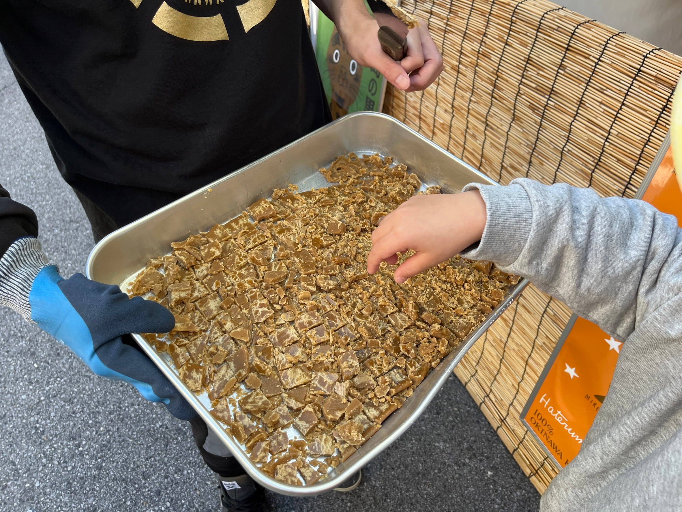 最後は、絞りたてのさとうきびで作った黒糖を試食。これがとっても美味しい!!