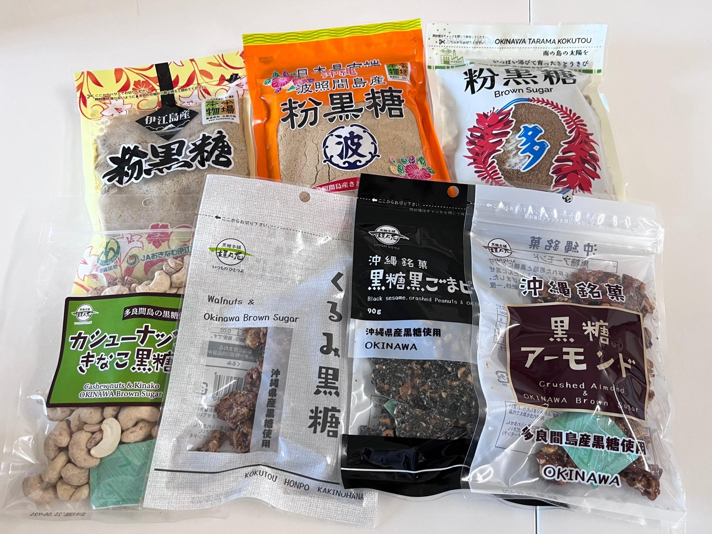 今回は、ちょうど「新糖」という、今年の冬にとれたさとうきびで作った粉黒糖が出ていたので購入しました。伊江島産、波照間産、多良間産と、各産地のものをゲット。それぞれ風味が異なるので、食べ比べも楽しいんです。お料理に使ったり、ヨーグルトにかけたりと重宝します。