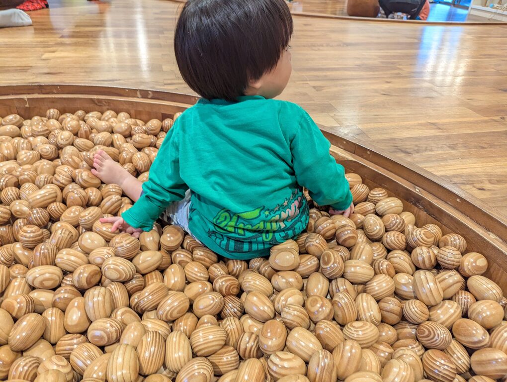 一般的なボールプールとは違い、コロンとした木のたまごが心地よい音を立てながら体を包み込みます。寝転んだり、埋もれたり、両手いっぱいにすくったり。木ならではの重みや感触に、子どもたちは夢中。