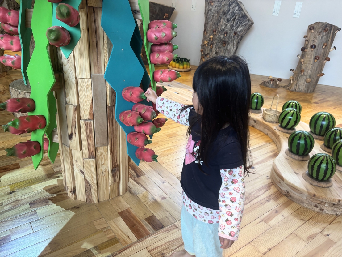 シークヮーサー、マンゴー、島バナナ、ドラゴンフルーツなど沖縄ならではの果物を収穫できるごっこ遊びコーナー。ゴーヤーやナーベーラー、南風原カボチャなど野菜も登場します。