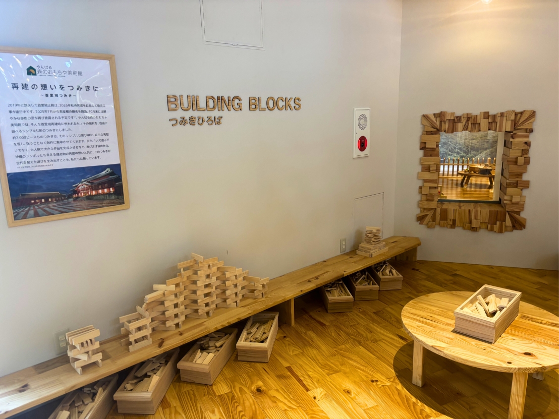 やんばる森のおもちゃ美術館は、世界自然遺産にも登録されたやんばるの森を背景にした木育施設。館内には木製のおもちゃが並び、視界に入るものの多くが“木”。一歩足を踏み入れると、ふわっと広がる木の香りに包まれます。