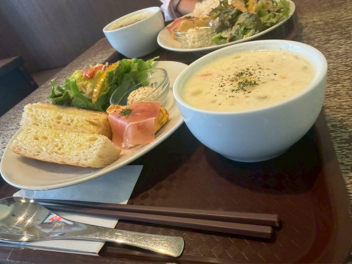 クラムチャウダーも濃厚すぎず、朝から重たくならないタイプ。あさりがいっぱい入っていました。