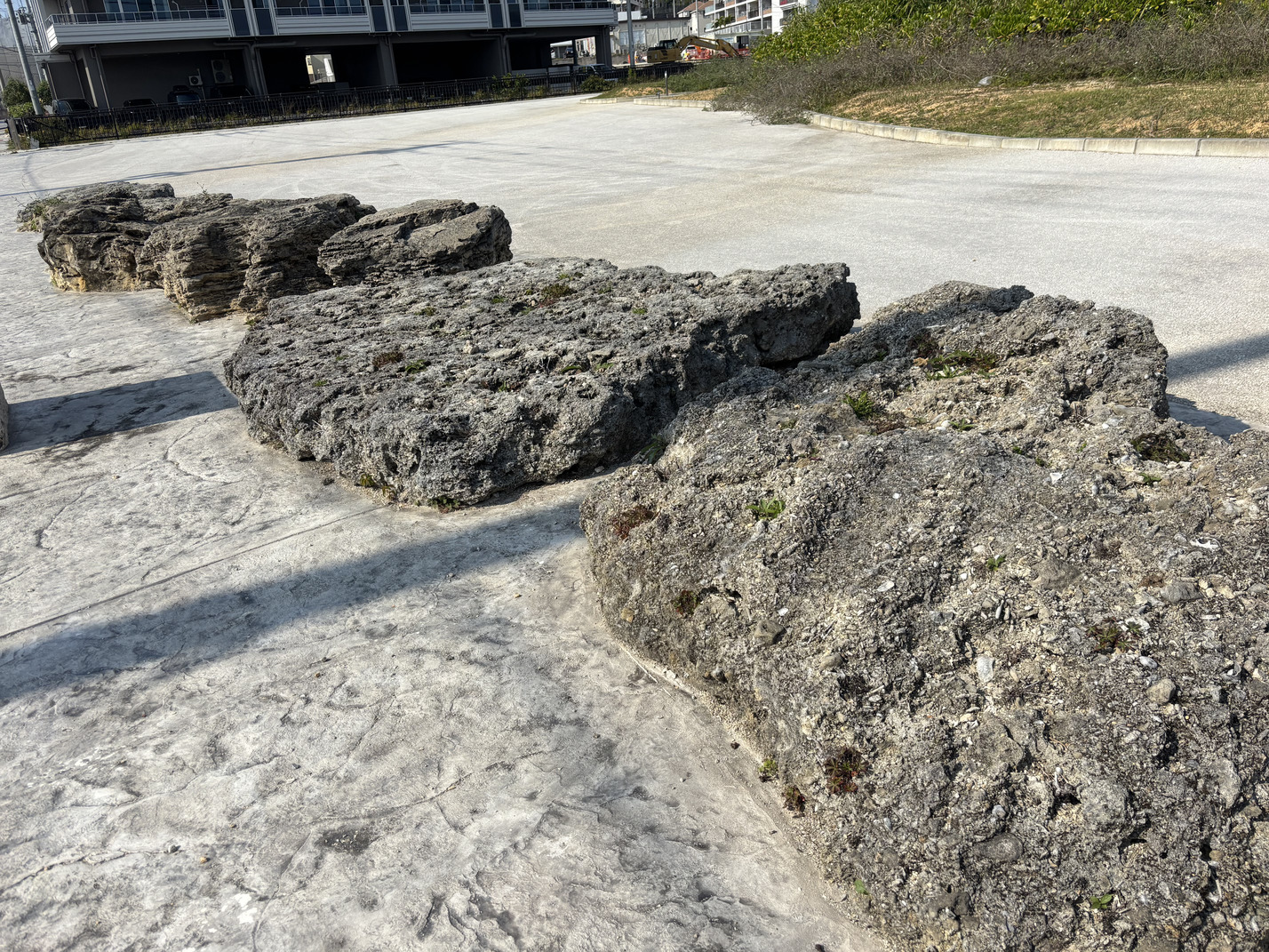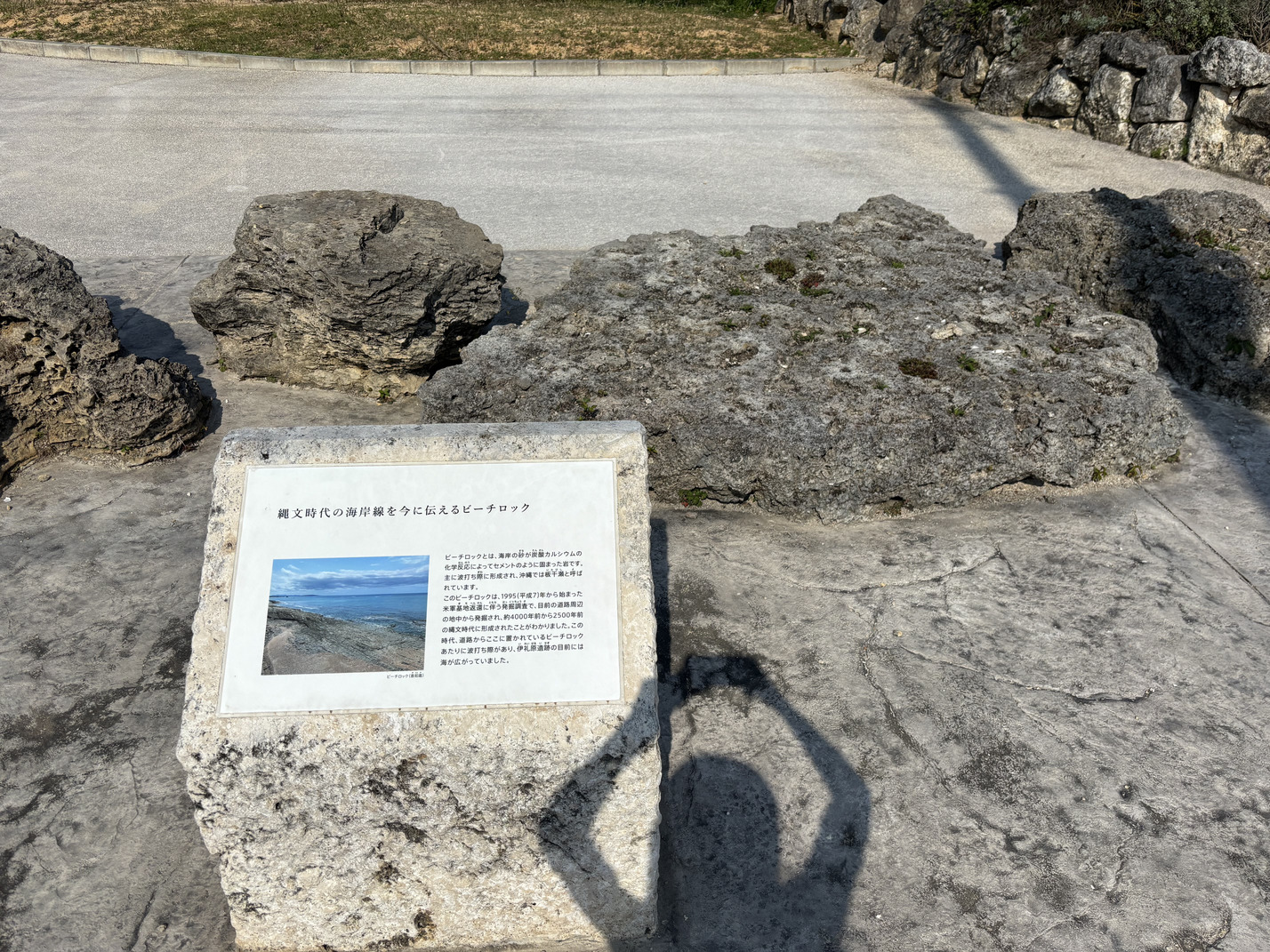 「この辺りが昔は海だった証拠」として展示されているビーチロック。目の前には今の街並み。