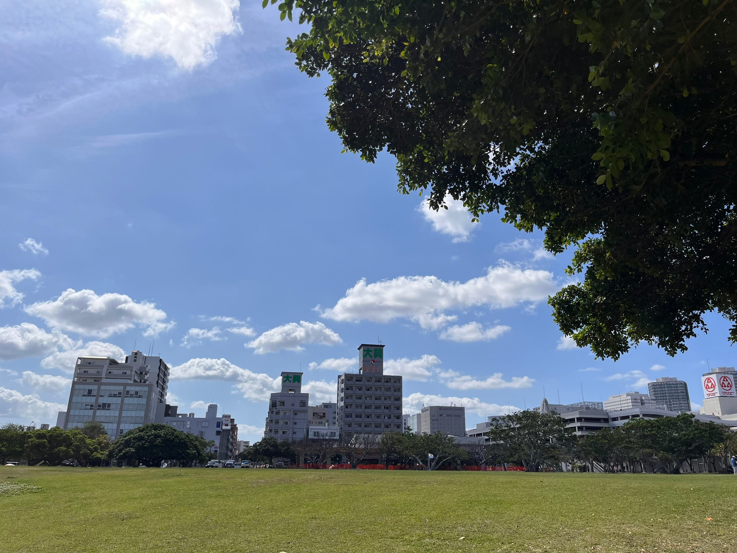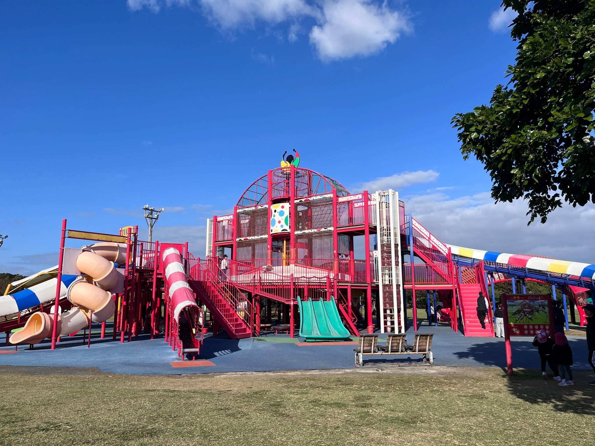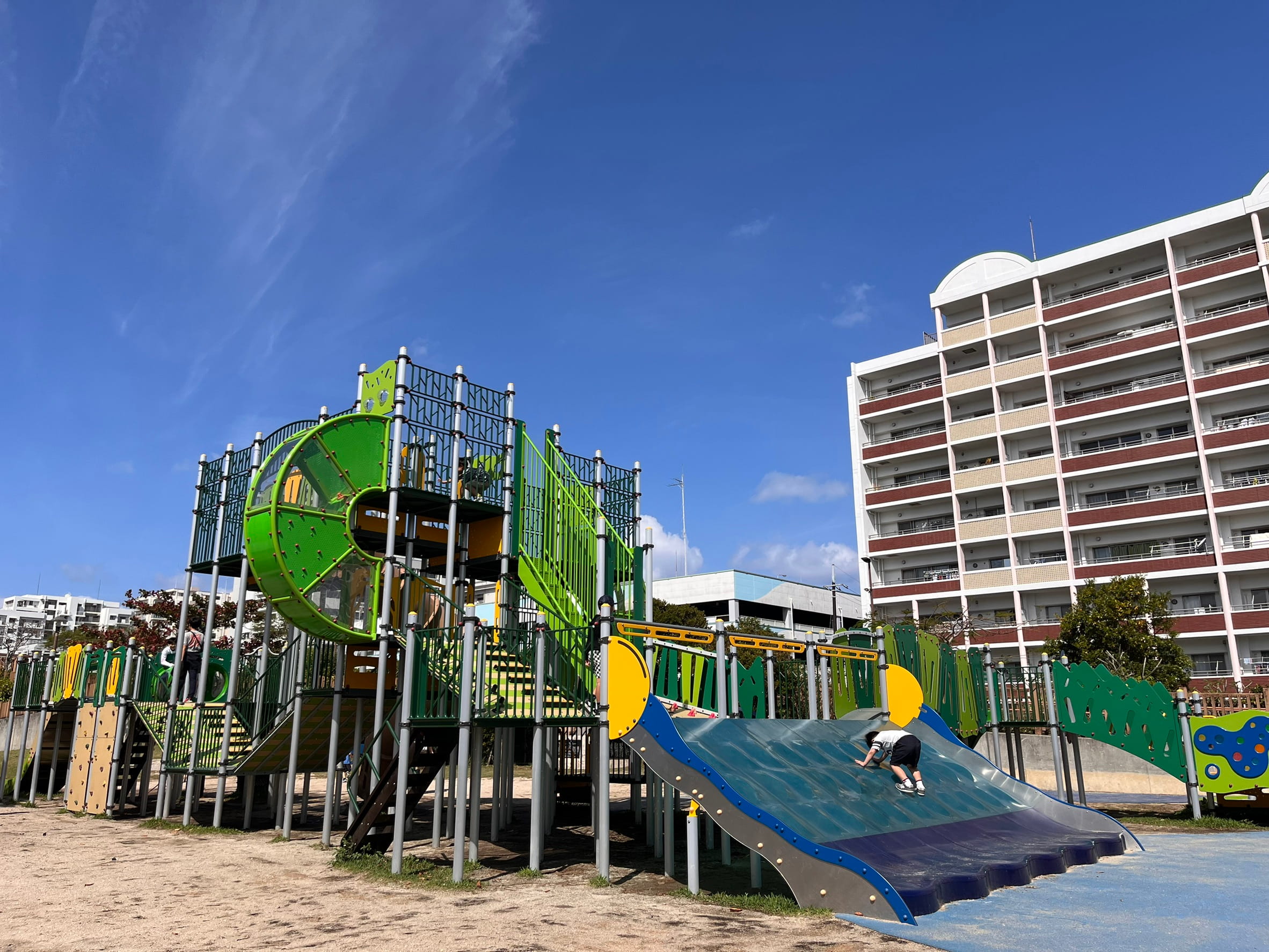 那覇市内でアクセスしやすく、人気の高い新都心公園。広い芝生エリアと2025年にリニューアルした遊具広場があり、休日には多くの親子連れでにぎわいます。