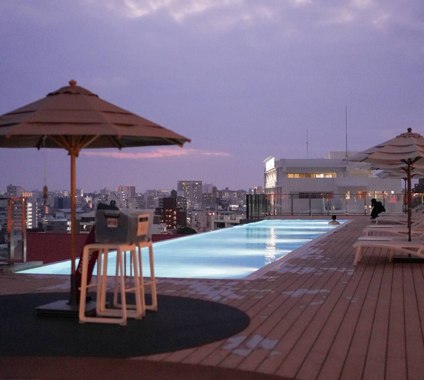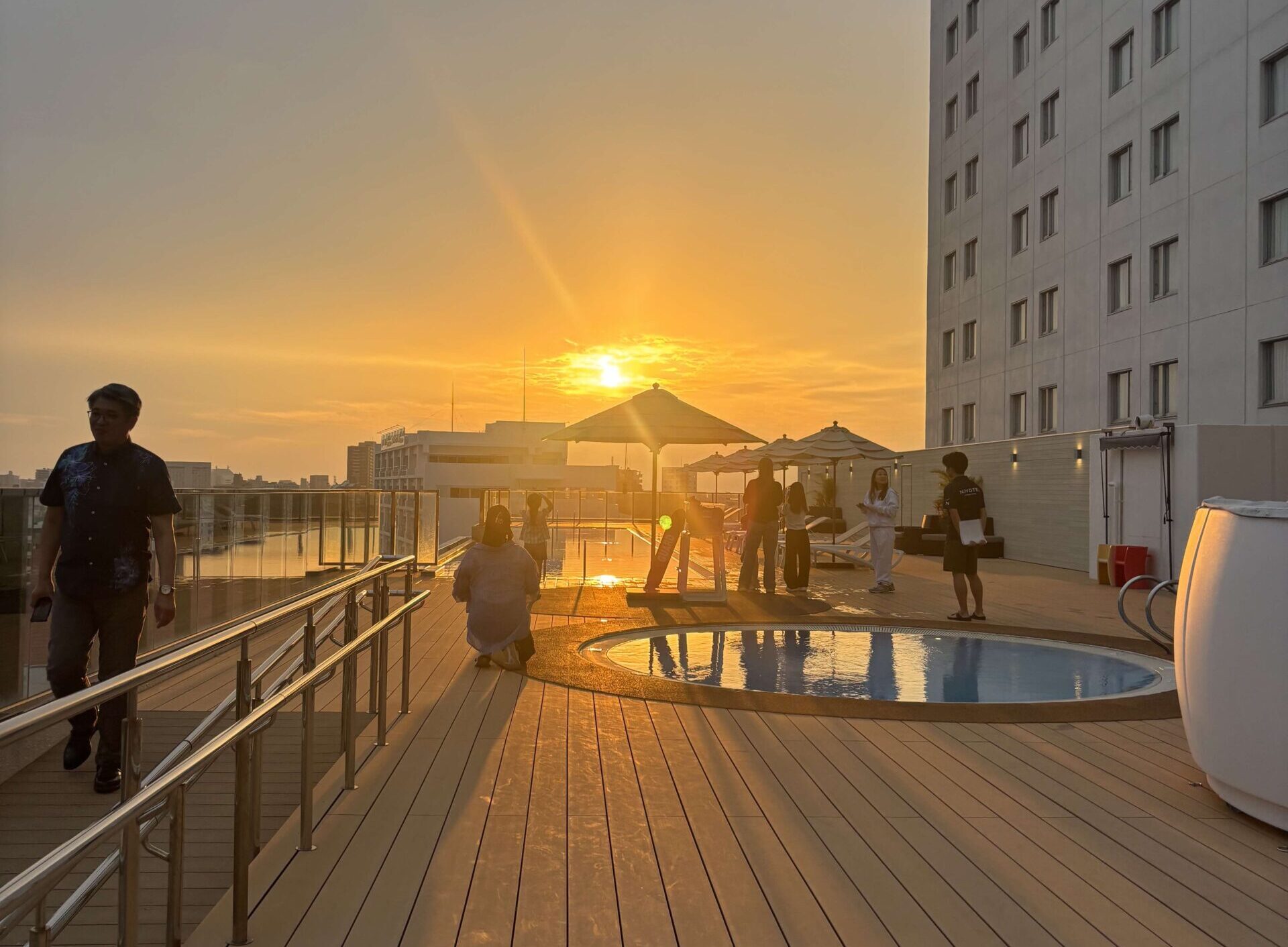 那覇の夕景に染まるプールサイドで過ごす時間は、日常のゆとりをチャージしてくれる。